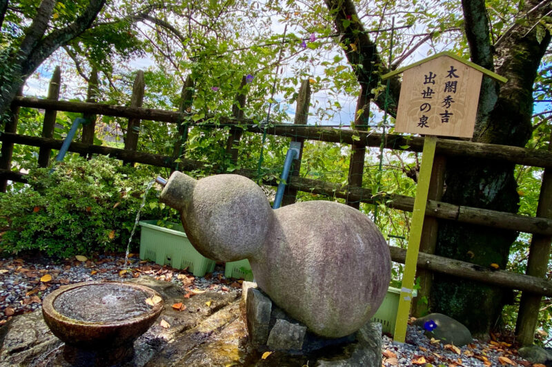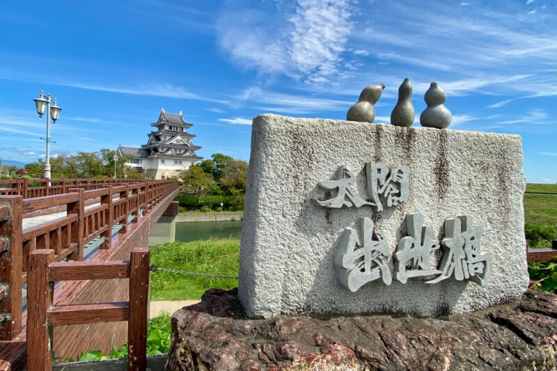 墨俣城へ渡る小径に設けられた「太閤出世橋」。来訪者はこの橋を渡って城址エリアに入ることで、秀吉の出世伝説を感じながら城跡へ導かれる演出がなされています。