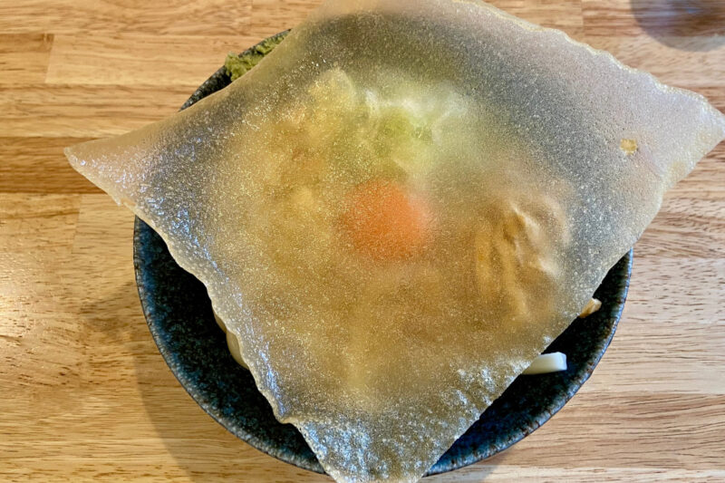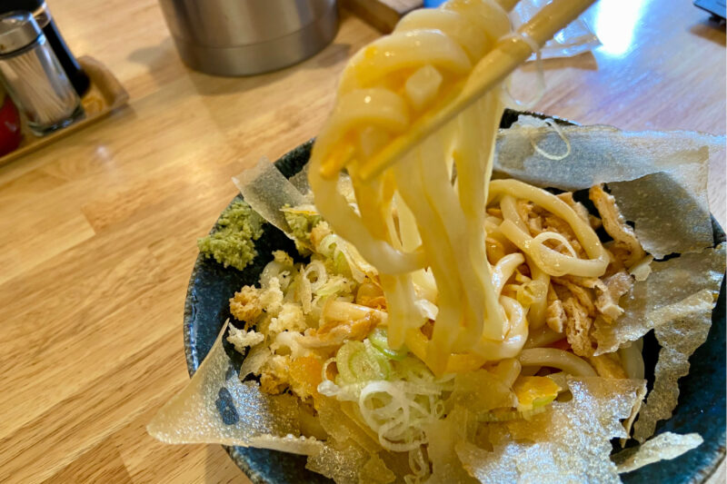 個人的感想:パリパリとツルモチのコントラストに驚き。冷たいうどんの爽快さと、濃すぎないつゆのバランスが絶妙でした。
