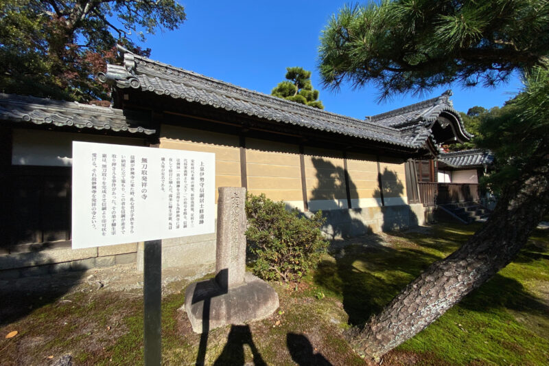 妙興寺は、戦国時代の名剣豪 上泉伊勢守信綱(新陰流の開祖)にとって、剣と禅の精神を研ぎ澄ます重要な修行の地でした。伝説によると、信綱はこの寺で「無刀取り」という、高度な剣術を体得したといわれています。無刀取りとは文字通り素手で相手の刀を制する術であり、信綱は丸腰で刀を取り込む技を編み出し、これを高弟の 柳生宗厳(後の柳生新陰流)に印可したとも伝えられています。