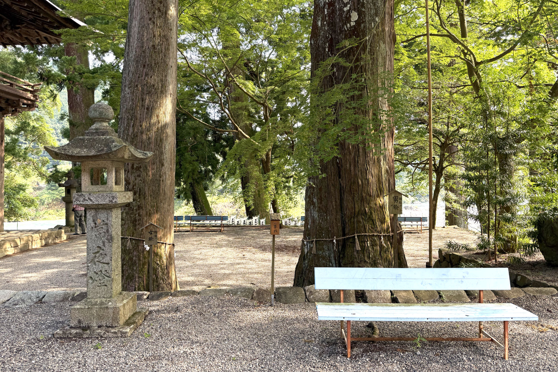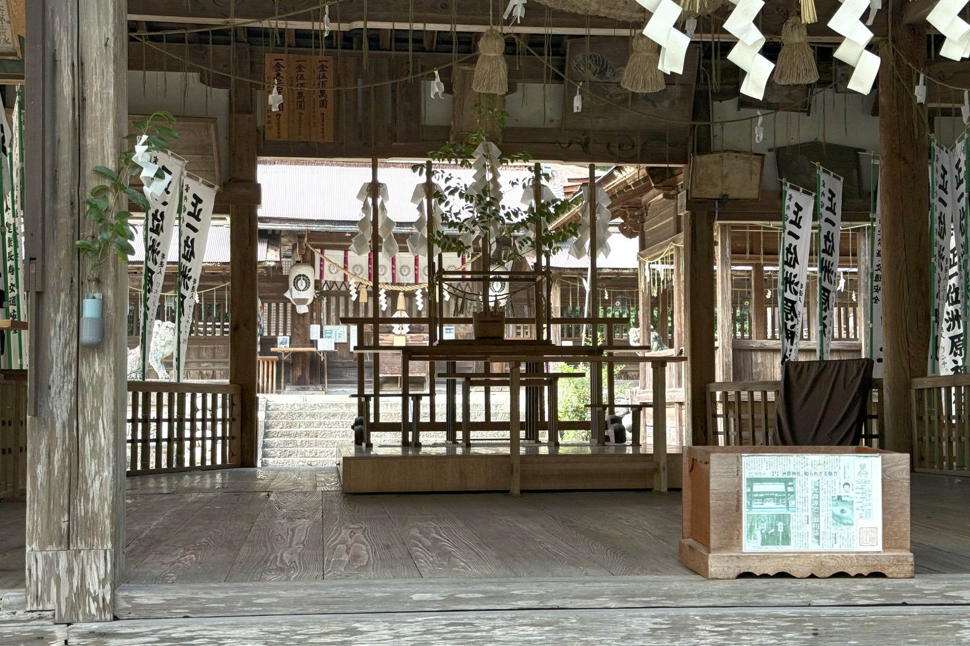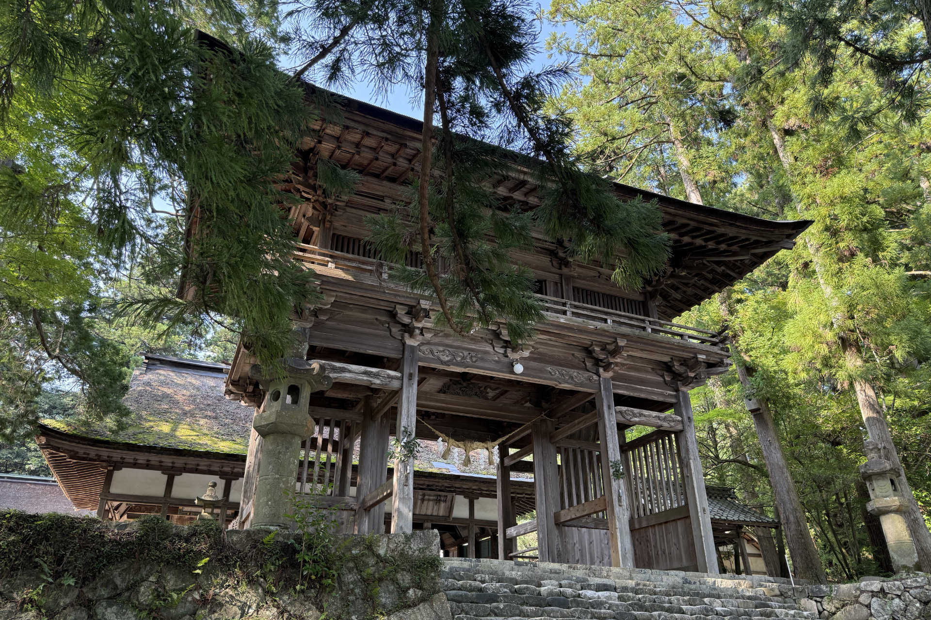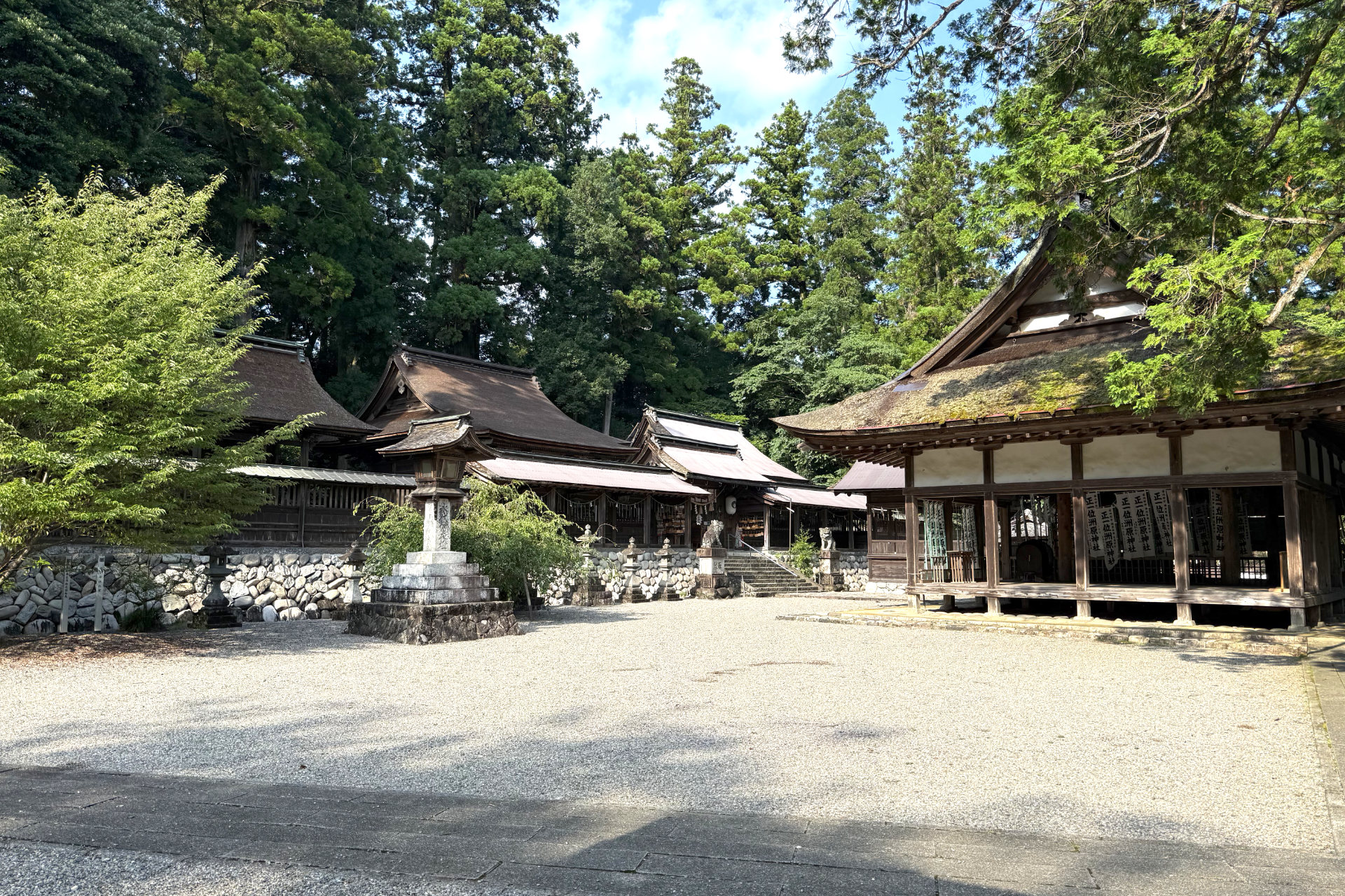 本殿は中央・東・西の三殿からなり、岐阜県の重要文化財に指定。拝殿や舞殿、そして印象的な楼門は美濃市の文化財です。特に楼門の上には大きな太鼓が据えられており、祭礼の際には響き渡る音が神域をさらに荘厳にします。重厚な建築美の中に、歴史と信仰が息づいています。